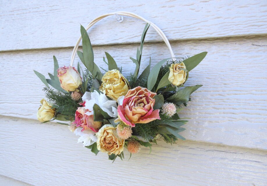 今回も素敵な作品をありがとうございます。大人っぽくて上品な色合いに一目惚れしました! 以前お迎えした薔薇のリースもとても素敵で色褪せるまで飾り続けていたのですが、今回のリースも日に何度も眺めてしまうほど素敵でうっとりしてしまいます。定位置の寝室に飾っています☆