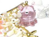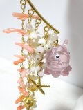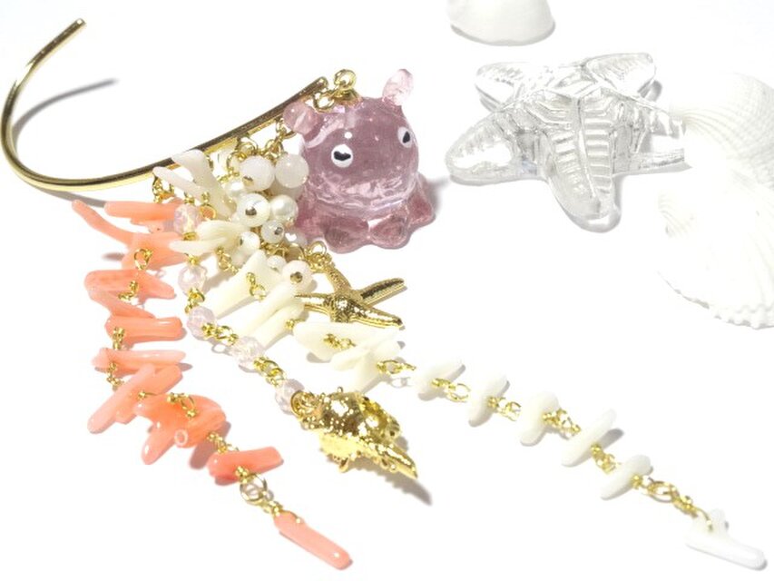 UVレジンで自作しました、透き通ったさくら色のメンダコをメインに、珊瑚や貝といった海をイメージさせるモチーフでまとめたイヤーフック。