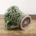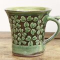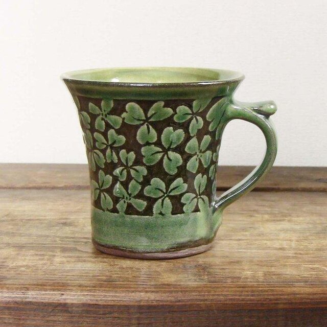 カップ全体に白い化粧泥を掛けてからカタバミを描き余分な化粧泥を削り落として図柄だけを残しています。