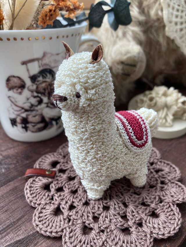この作品の最大の特徴は、その「毛並み」の表現にあります。ボディを編み上げた後、さらに表面に毛並みを編みつける二重構造で仕立てています。非常に手間のかかる工程ですが、アルパカ特有の柔らかな質感を出すためにこだわりました。これにより、アルパカらしい、ふっくらとした立体感と柔らかな手触りを実現しています。