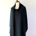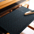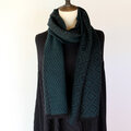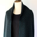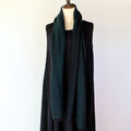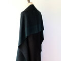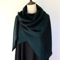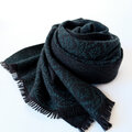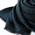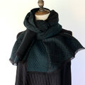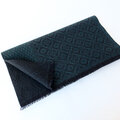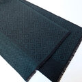 ブラックの糸をベース織りに、深みのある青味のグリーンの糸で柄を織り出しています。布幅の三分の一ほどは織柄を変えて色の出方にも変化をつけているので、表と裏で表情の違いをお楽しみいただけます。広げて肩から羽織るだけでなく、首元に巻いてマフラーのようにもお使いいただけます。フリンジは縁かがり止めしてるので、糸がほつれてくることはありません。落ち着いたトーンのシックでエレガントな雰囲気のストールで、秋冬コーデのポイントとしてお使いいただけると思います。