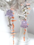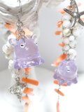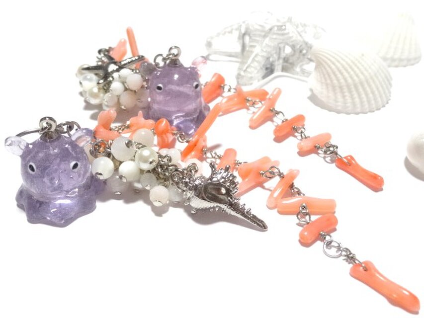 UVレジンで自作しました、透き通ったふじ色のメンダコをメインに、珊瑚や貝といった海をイメージさせるモチーフでまとめたアシンメトリーなロングピアス。華やかな桃色の枝珊瑚をたっぷりと使用し、枝珊瑚を一つ一つ丁寧にワイヤーで繋ぎました。動きがあるたびに枝珊瑚が揺れ、印象的です。