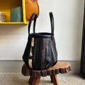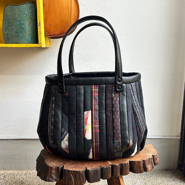黒の牛革と着物の生地(古布)でパッチワークをして作りました。