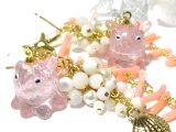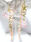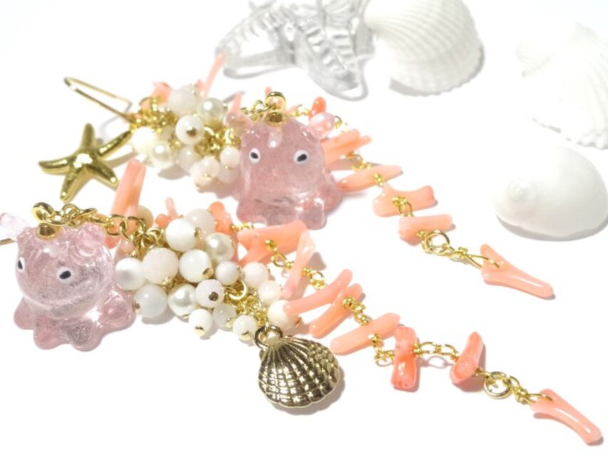 UVレジンで自作しました、透き通ったさくら色のメンダコをメインに、珊瑚や貝といった海をイメージさせるモチーフでまとめたアシンメトリーなロングピアス。華やかな桃色の枝珊瑚をたっぷりと使用し、枝珊瑚を一つ一つ丁寧にワイヤーで繋ぎました。動きがあるたびに枝珊瑚が揺れ、印象的です。