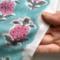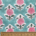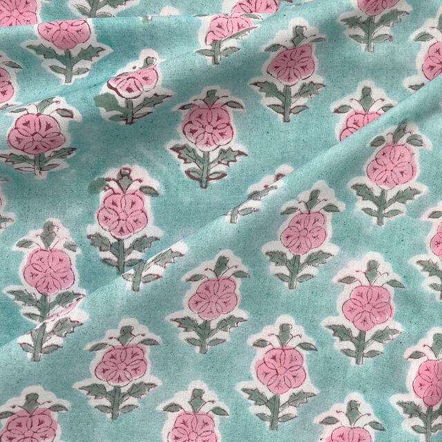 インド ブロックプリント生地 [50cm単位切売]サンガネリ ピンクフラワー on シアンブルー 花 SA IF0429