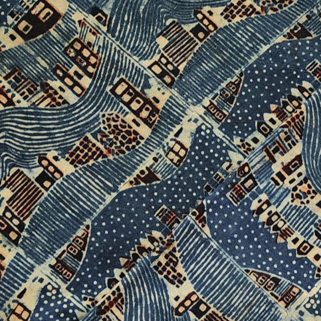 インド ブロックプリント生地 [50cm単位切売] アジュラック 街並み インディゴ 街 家 建物 SA IF0415