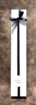 高級感のある布張りのケースに入れて、専用の白い箱に紺色のリボンをかけて