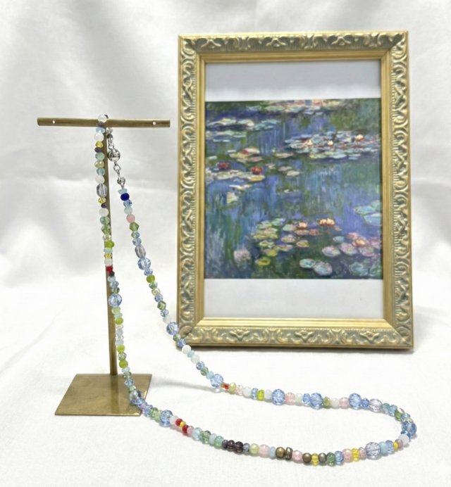 本作品は、その中のごく一部を切り取ったもので、ビーズならではの輝きで再構築したオリジナルの色彩表現です。身につけた時の肌馴染みの良さと、絵画の世界観を感じられるようなバランスにこだわって配色しています。
