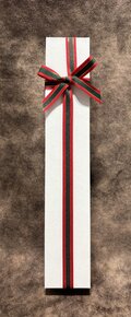 高級感のある布張りのケースに入れて、専用の白い箱に紺色のリボンをかけて