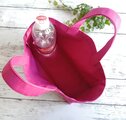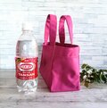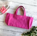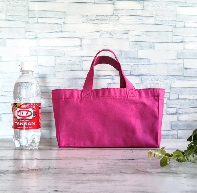 帆布なのに軽いです。そして丈夫。隣に並べているのは500mlペットボトルです。マチが10cmとたっぷりなので意外と大容量です。ちょっとしたお出かけに丁度よいサイズ感で携帯電話、お財布、巾着袋、ハンカチ、メガネケース、キーケースが収まります。フェイスタオルですと3枚がゆったりと入ります。A4サイズも入ります。