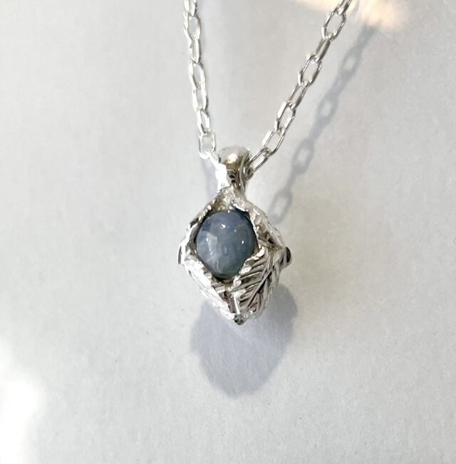 深いライトグレーと美しい輝きを持つスターサファイアと、繊細なリーフモチーフが調和しています。