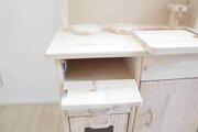 お子様の安全性を考慮し無塗装となっており、ビス止めの穴にも全て穴埋め加工しております。エッジ部分は全て、面取り加工を行い丸みを帯びさせることで、取り扱い上の安全性を向上させ、可愛らしい印象になるよう仕上げております。