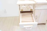 出来るだけ長くお使いいただきたいため、少し大きめのサイズとなっており、おままごとキッチンとしての役割が終わったあとも、インテリアの収納や家事などの作業台として活用できるよう設計しております。