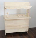 背面板を上下にオープンすることができ、オープンするとカウンターテーブルとオーニングに変わり、お店屋さんごっこがより一層楽しい時間になります。オーニングには曲線を使ったデザインを施し、可愛らしい雰囲気を全面に出しております。クローズした際は小物置きになります。