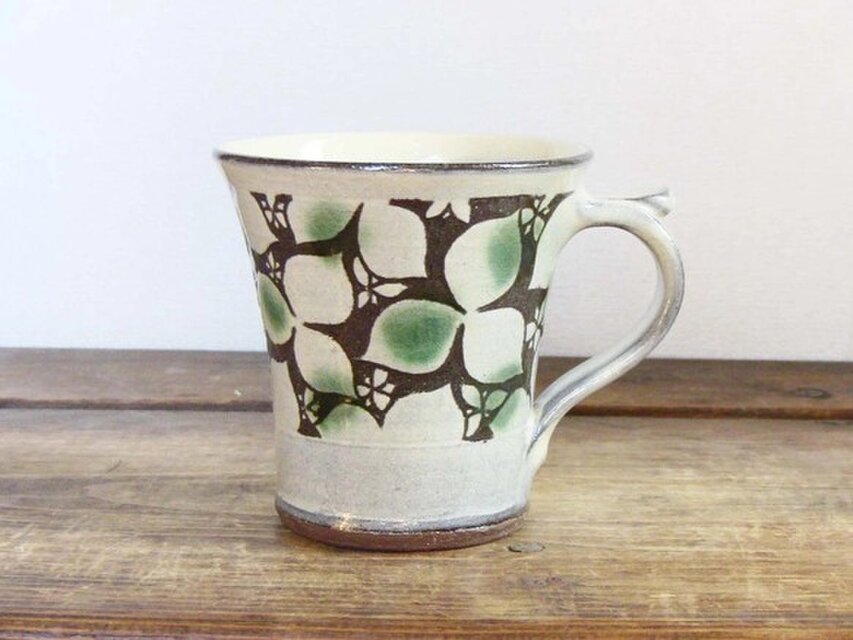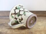 カップ全体に白い化粧泥を掛けエンレイソウを描いてから余分な化粧泥を削り落として図柄だけを残しています。