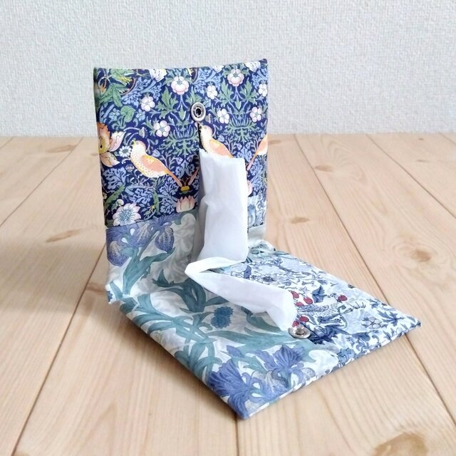 V&Aウィリアムモリス パッチワークの携帯ティッシュケース ボックスティッシュから詰替え いちご泥棒他 ブルー系 556