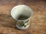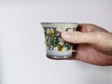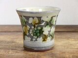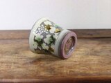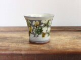 カップ全体に白い化粧泥を掛けてから葡萄を描き余分な化粧泥を削り落として図柄だけを残しています。