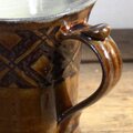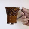 カップ全体に化粧泥を掛け格子模様を描いてから余分な化粧泥は削り落として図柄だけを残しています。