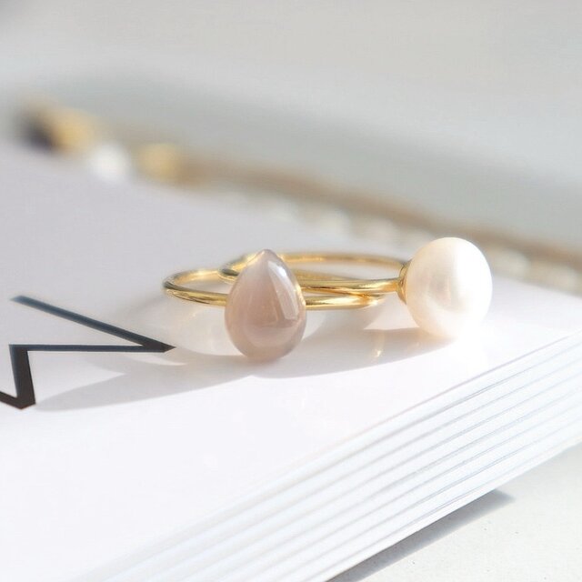 ドロップ型のグレーオニキスはつるんとした艶が魅力的なリング。半透明のライトグレーが目を惹きます。