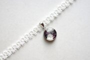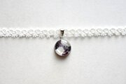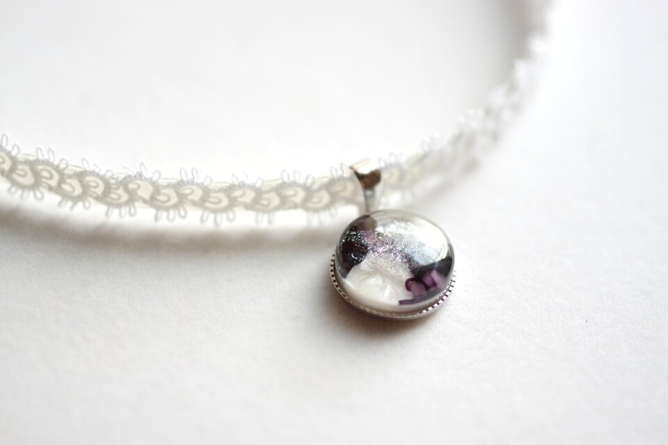 落ち着いたブラックとパープルが繊細な印象のレジンを、サテンリボンにタティングレースで装飾を施したチョーカーに仕上げました。