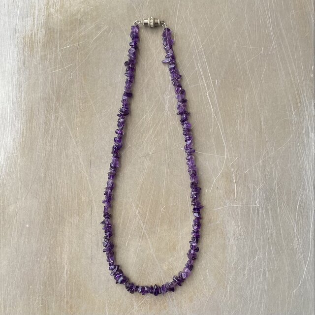 ラフカットのアメジストが輝くUSAヴィンテージネックレス。レトロな金具がお洒落なポイント。身につけやすいサイズ感でコーディネートの差し色におすすめです。