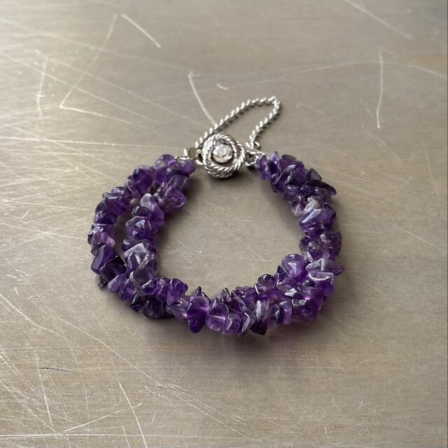 ラフカットのアメジストが輝くUSAヴィンテージブレスレット。揺らめくセーフティーチェーンがエレガントな雰囲気。ほどよいボリューム感の2連タイプでコーディネートの差し色におすすめです。
