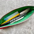 写真4枚目はサイズの参考です。ペン2本、カッター1本が入っています。お気に入りのボールペンと付箋を少し入れてお仕事にどうぞ!
