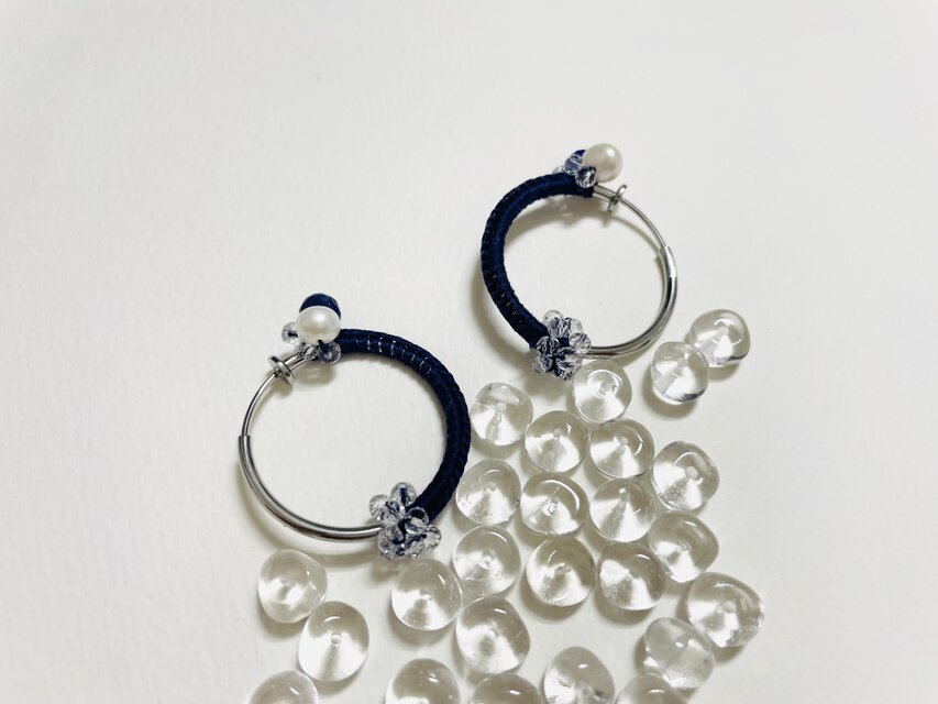 美しいフランス刺繍糸を編み、上質なラピスラズリと淡水パール、ガラスビーズをひと針ひと針丁寧に縫い付けた、ピアスに見えるイヤリングです。