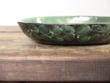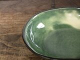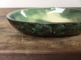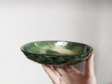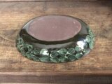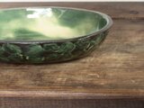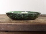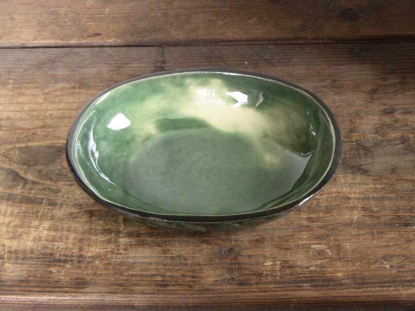 皿の内側に化粧泥を掛けてから外側に筆で花模様を描き全体に織戸釉を施釉して焼成しています。