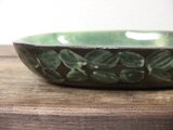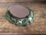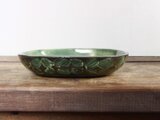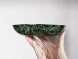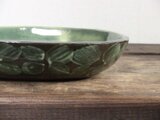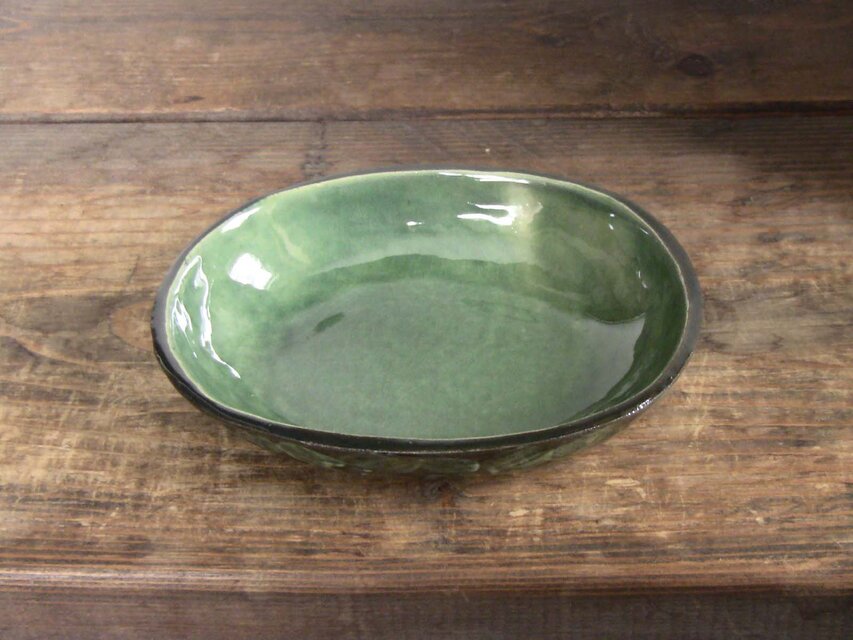 皿の内側に化粧泥を掛けてから外側に筆で花模様を描き全体に織戸釉を施釉して焼成しています。