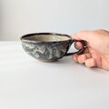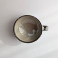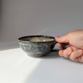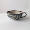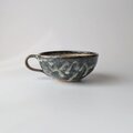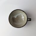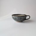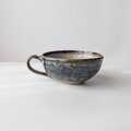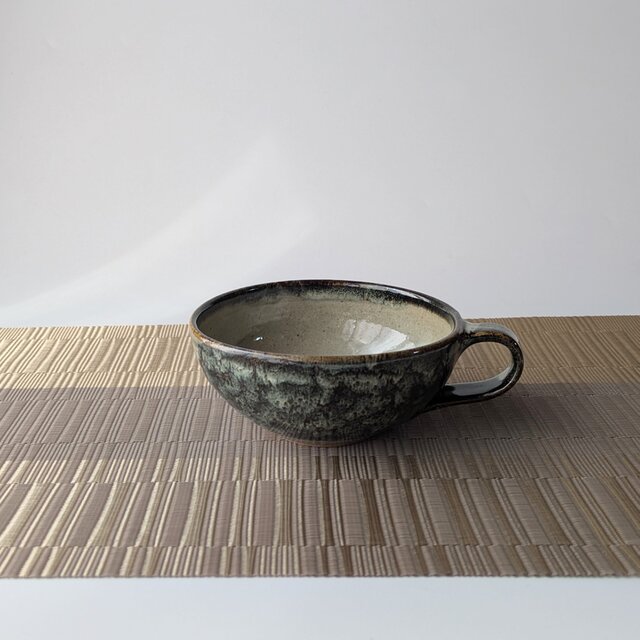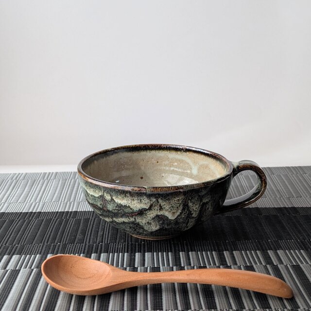 深みのあるグレーや、ホワイト、グリーンなど様々な色が溶け合い、釉薬が流れることで生まれた豊かな表情が印象的な、手仕事のスープカップです。