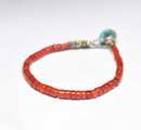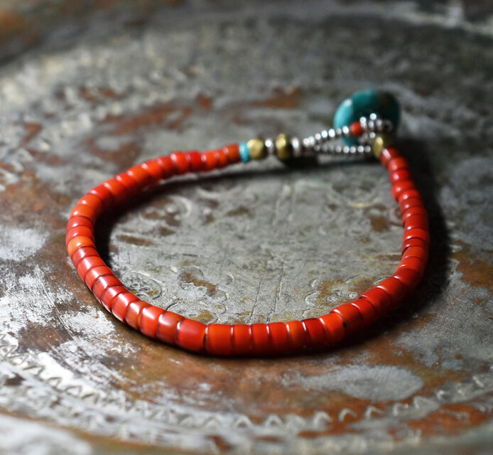 アンティーク飴色と朱赤色ホワイトハーツと一粒ターコイズブルーシェブロンを繋いだブレスです。