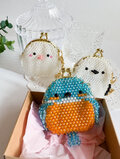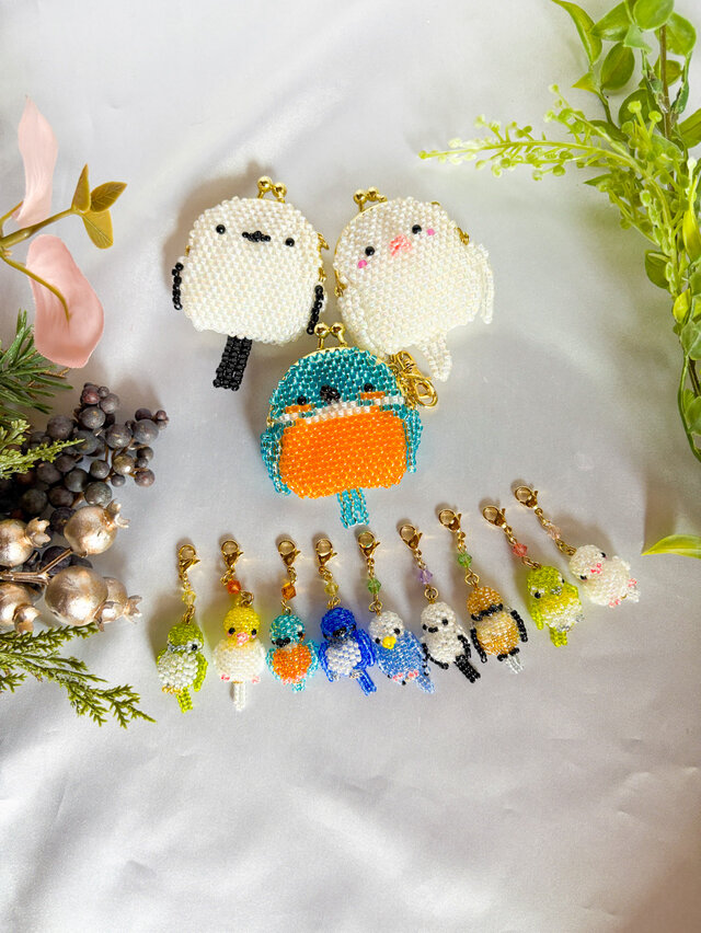 鳥好きのあなたにぴったりなこのセットは、華やかなビーズを使ったがま口と可愛らしい小さな鳥ストラップとのセットです。