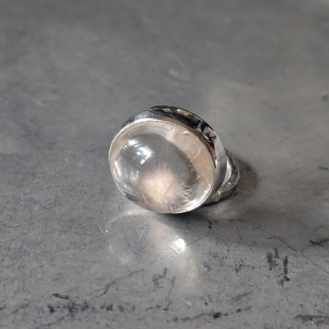 淡いピンク色の繊維状の角閃石(アンフィボール)が内包されたアンフィボールインクォーツをシルバーリングに仕立てました。