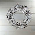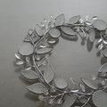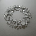 葉っぱとダリアに洋菊、エノコログサなどをモチーフに、草花の茎が絡まり合うように ゆるやかなラインでパーツをつないだ 花かんむりのような形のリースです。