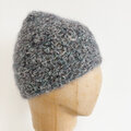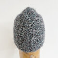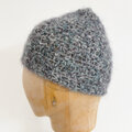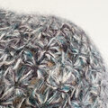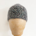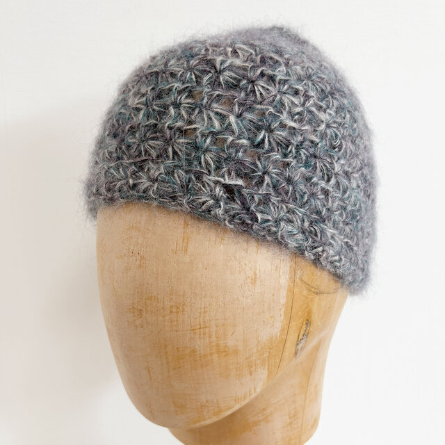 パープル、グリーン、ホワイトの3色のモヘアで編んだアスタリスク模様のニット帽です。とても軽くフワフワとしていて、耳まですっぽり被るととても暖かいです。