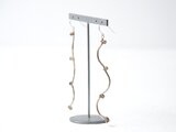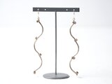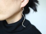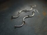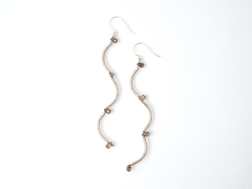 側面に民族模様の施された湾曲シルバーチューブと小ぶりスモーキークォーツのドロップを繋ぎ、シルエットの際立つロングピアスに仕立てました。