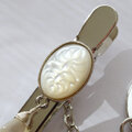 こちらは表面に草花が彫刻されたホワイトシェルのカボションを使用しました。
