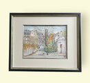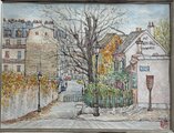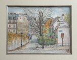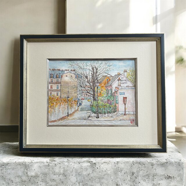 秋のパリ、モンマルトルです。シャンソンを聞ける有名なお店、ラパンアジルが見えます。ていねいに描かれた水彩画で、微妙な色合いがとても美しいです。
