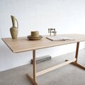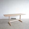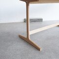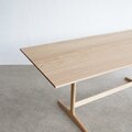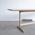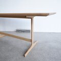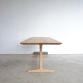 天板はあえて薄く仕上げ、エッジにはシャープな面取りを施しています。脚部はT字型の構成とし、天板を浮かせるように幕板を配することで、横から見た際にも軽やかな印象になるよう設計。