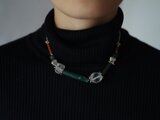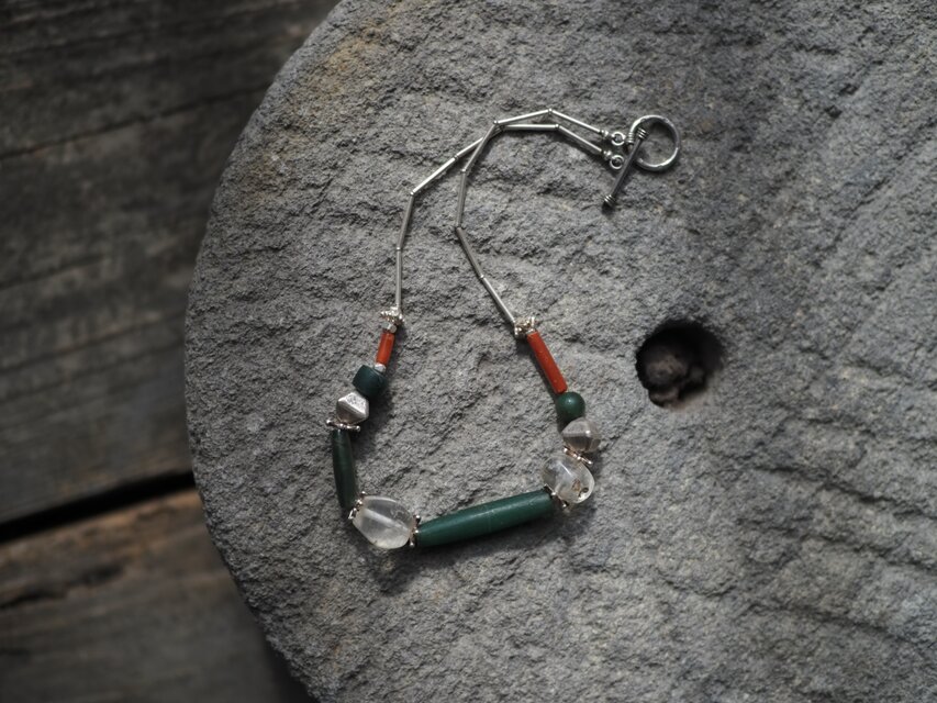 様々なピュービーズとカレンシルバーを組み合わせ、唯一無二の存在感あるショートネックレスに仕立てました。