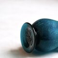 宙吹きによるハンドブロウで成形され、約1.3kgの肉厚なガラスならではの重厚感と、表面に残るゆらぎが手仕事ならではの魅力。深みのあるブルーグリーンの色ガラスには微細な気泡が含まれ、光の当たり方によって豊かな表情を見せてくれます。