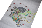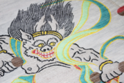 ■意匠:雷神図 太鼓を打ち鳴らし、光を放つ雷神の姿をダイナミックに表現しました。古来より「厄除け」や「五穀豊穣」の象徴とされる雷神は、身に纏うだけで力が湧いてくるような縁起の良いモチーフ。繊細な色使いが、黒地の帯に立体的な奥行きを生んでいます。