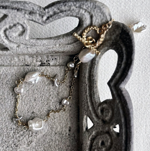 儚くて静寂、静けさのなかに美しい光を放つパールを集めたブレスレット。