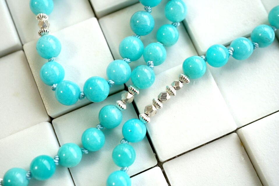 ペルー産の美しいアマゾナイト(6mm)をシルク糸で結びながらつないでいったネックレス。エメラルドグリーンと言ってもいいかと思うのですが、お写真よりさらに濃く美しい色合いの石たちです。