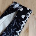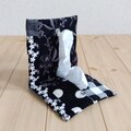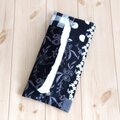 モノトーンの刺繍生地などをパッチワークした、携帯用のティッシュケースです。