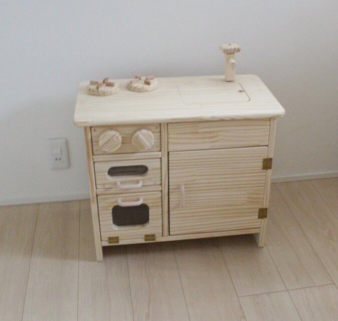 本製品はシンク部分以外は全てパイン材を使用しますので木目の整った天然パイン材の美しさ、高級感、手触りをより一層実感いただける「おままごとキッチン」に改良しております(シンク部分のみホワイトウッド)。