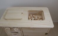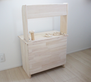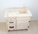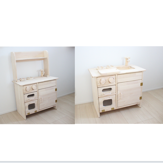 本製品はシンク部分以外は全てパイン材を使用しますので木目の整った天然パイン材の美しさ、高級感、手触りをより一層実感いただける「おままごとキッチン」に改良しております(シンク部分のみホワイトウッド)。