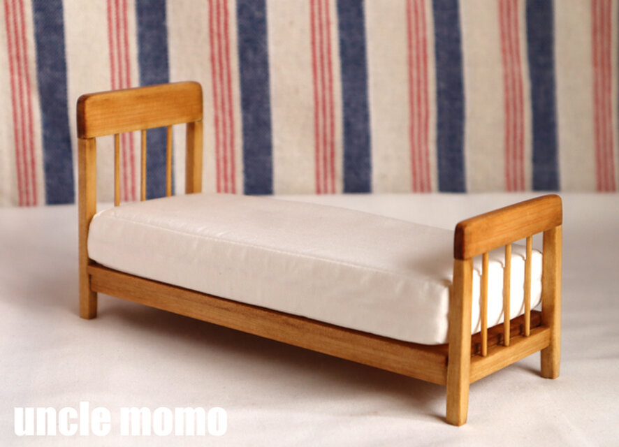シンプルでナチュラルなデザインのベッドのミニチュアです。