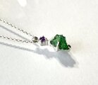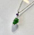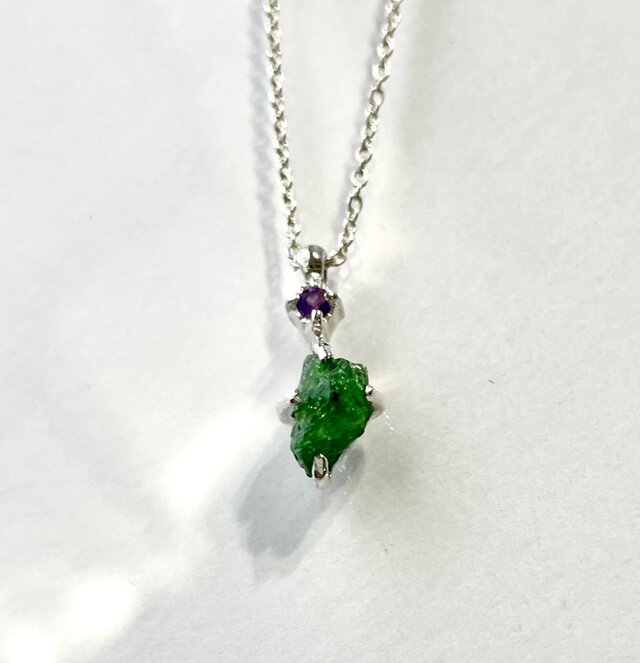 ナチュラルグリーンの原石にパープルカラーのアメジストを合わせ、個性的なカラーのペンダントに仕上げました。